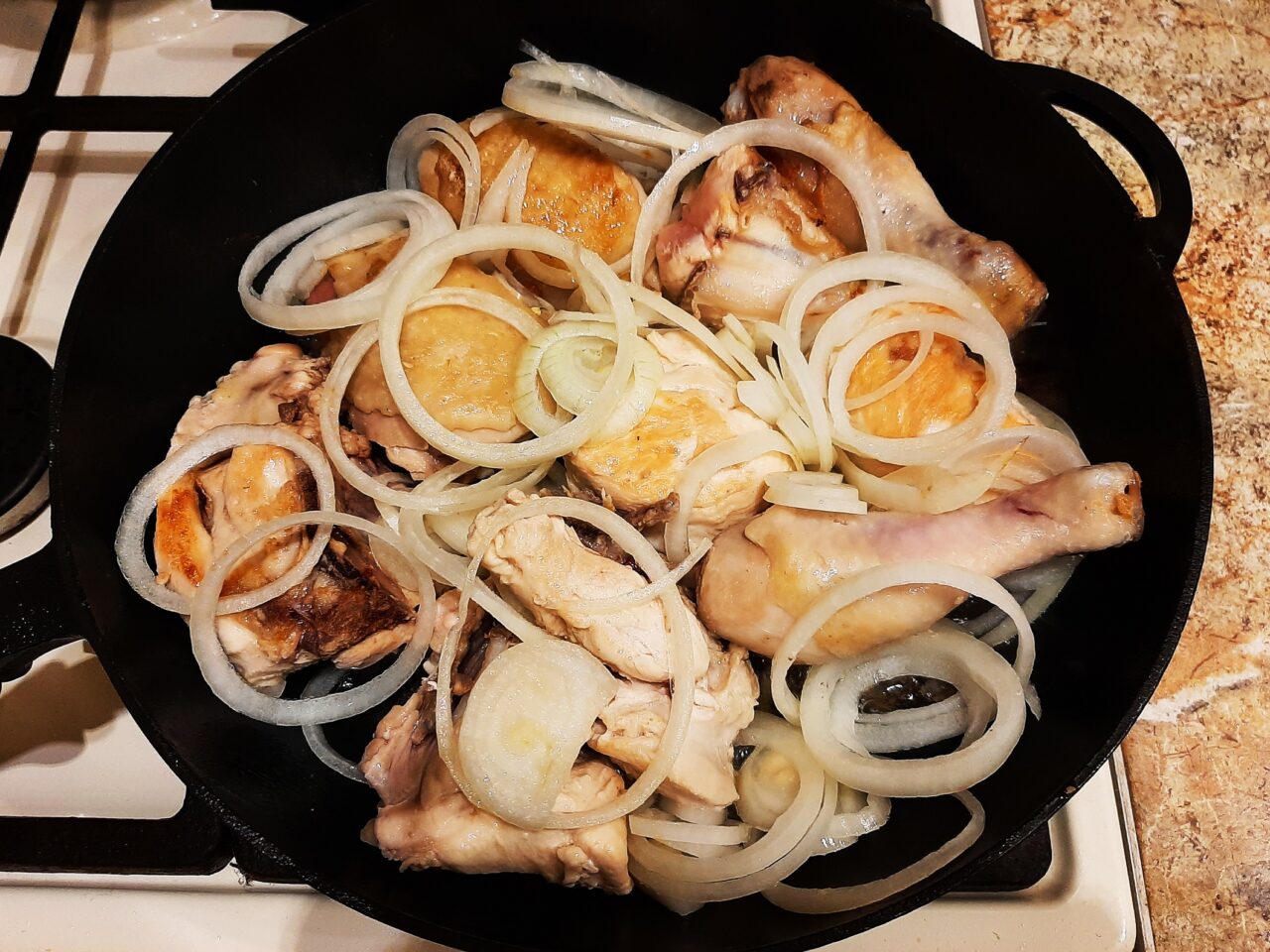 - Add the onion rings to the meat and reduce the heat.
