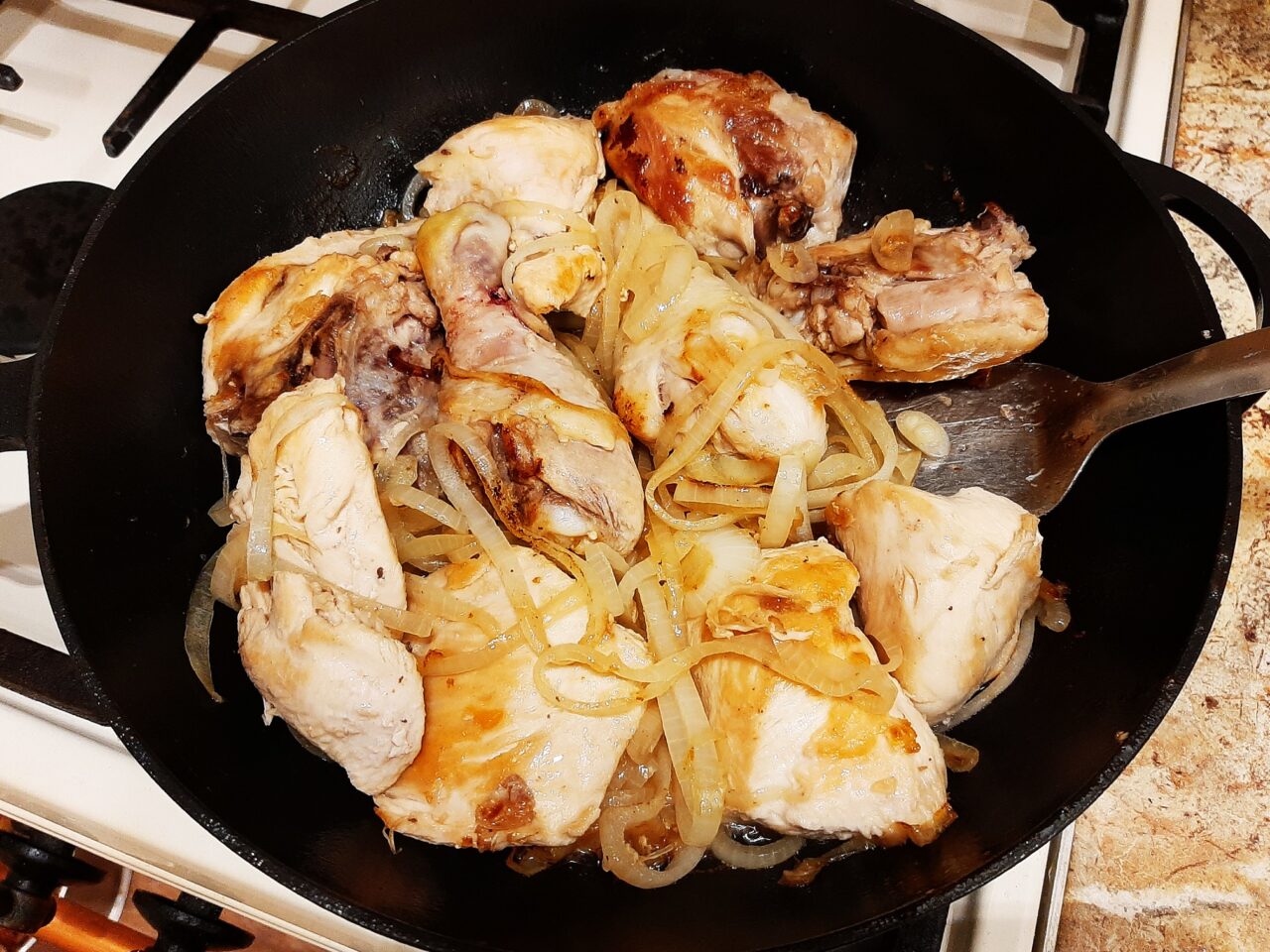 - Continue to fry the contents of the pan for another 5-7 minutes, stirring occasionally. At the end of frying, the onions should be soft and golden brown.
