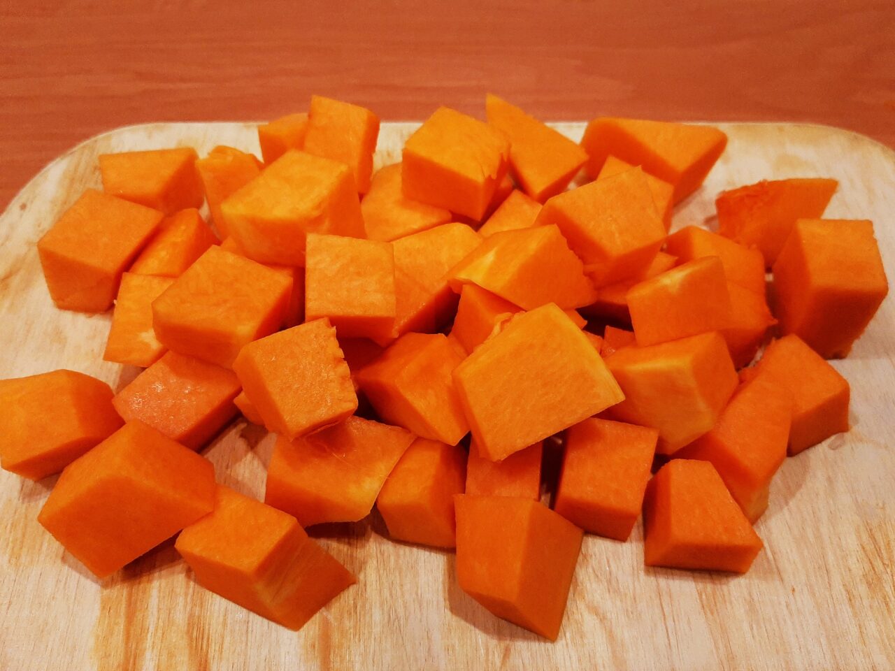 - Cut off the hard rind from the pumpkin, remove the seeds and soft fibers from the flesh. Cut the vegetable into 2-3 cm cubes.