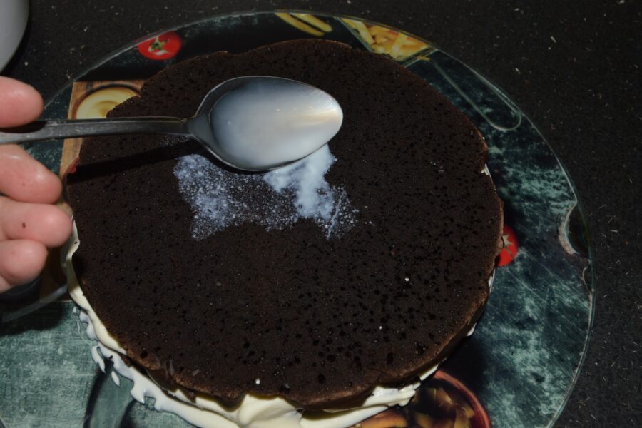- All 3 pieces of sponge cake must be thoroughly soaked in milk; you can use a spoon.