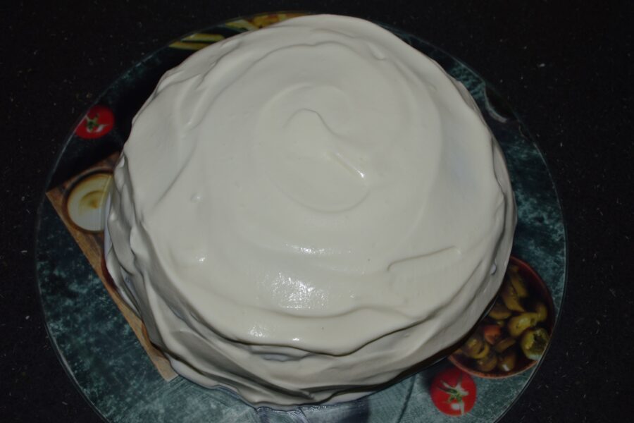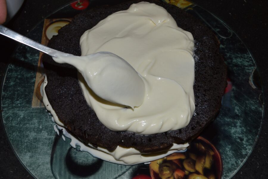 - Then spread the cream on top, using plenty of it, as this amount of ingredients will be enough for the whole cake.