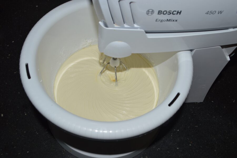 - Beat with a mixer first at medium speed for one minute, then at high speed for 8-10 minutes, until the cream thickens well.