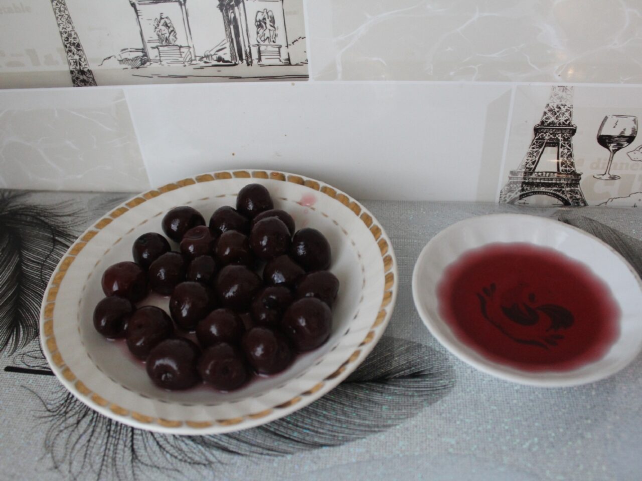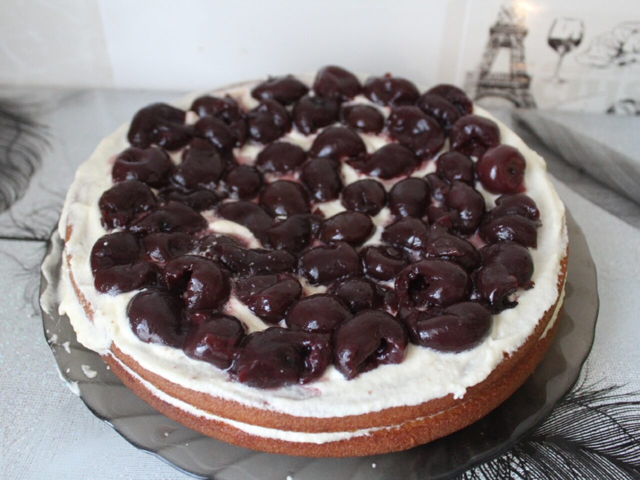 - Place the second sponge cake on top of the first one, which has been soaked and generously coated with cream, then soak it with juice and coat it generously with cream. Remove the pits from the cherries and cover the sponge cake completely with the berries.