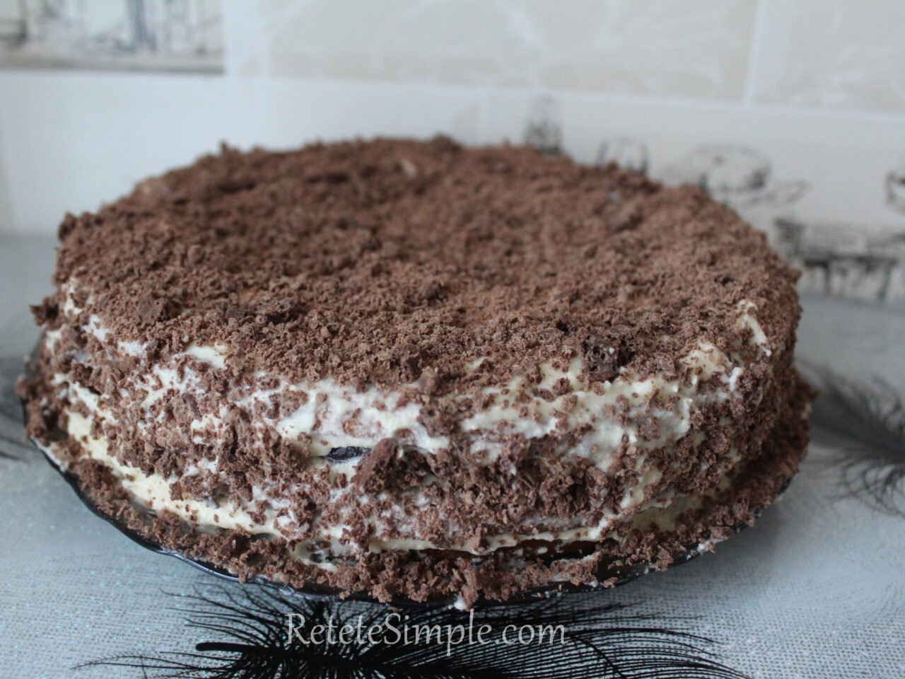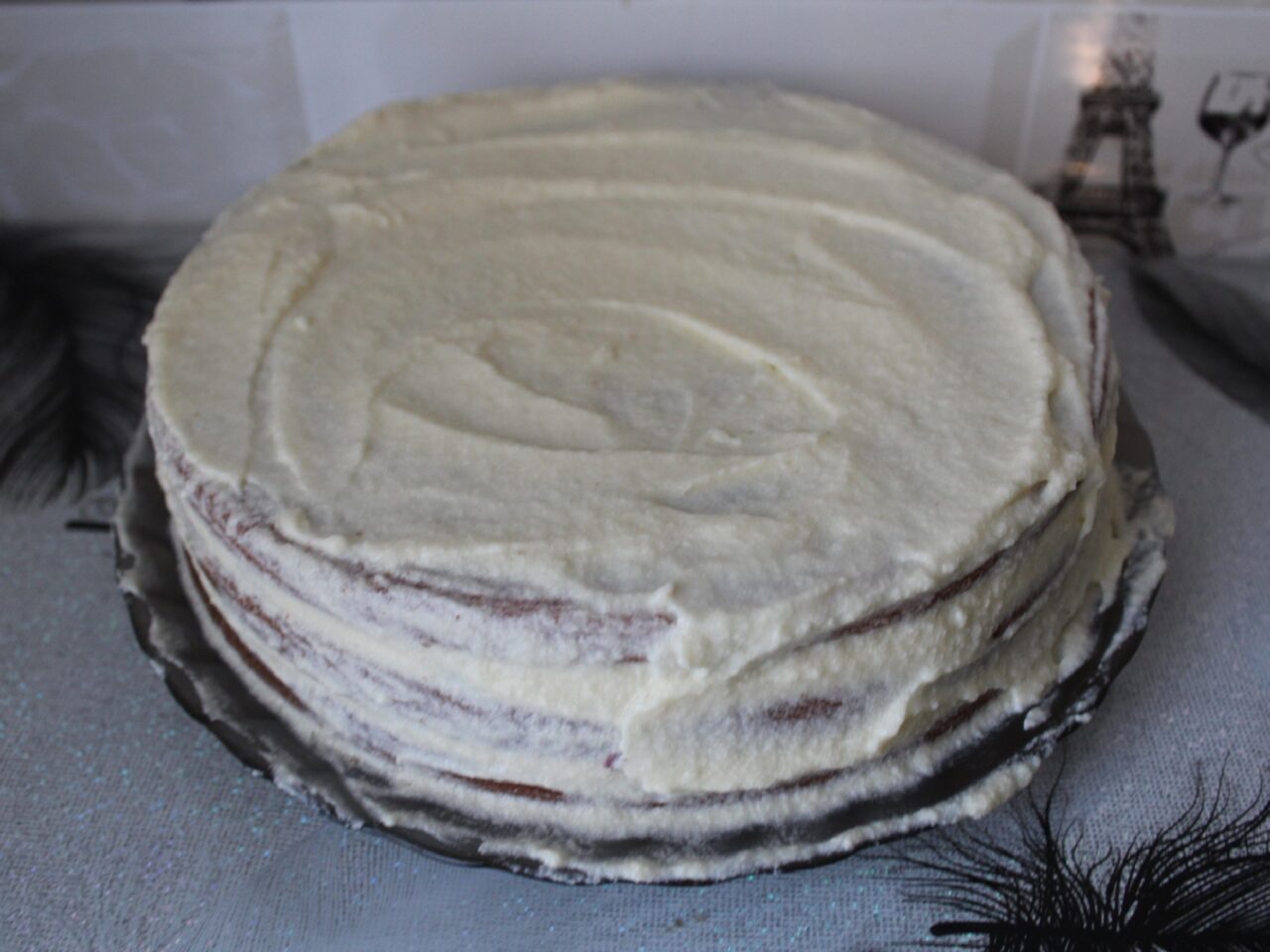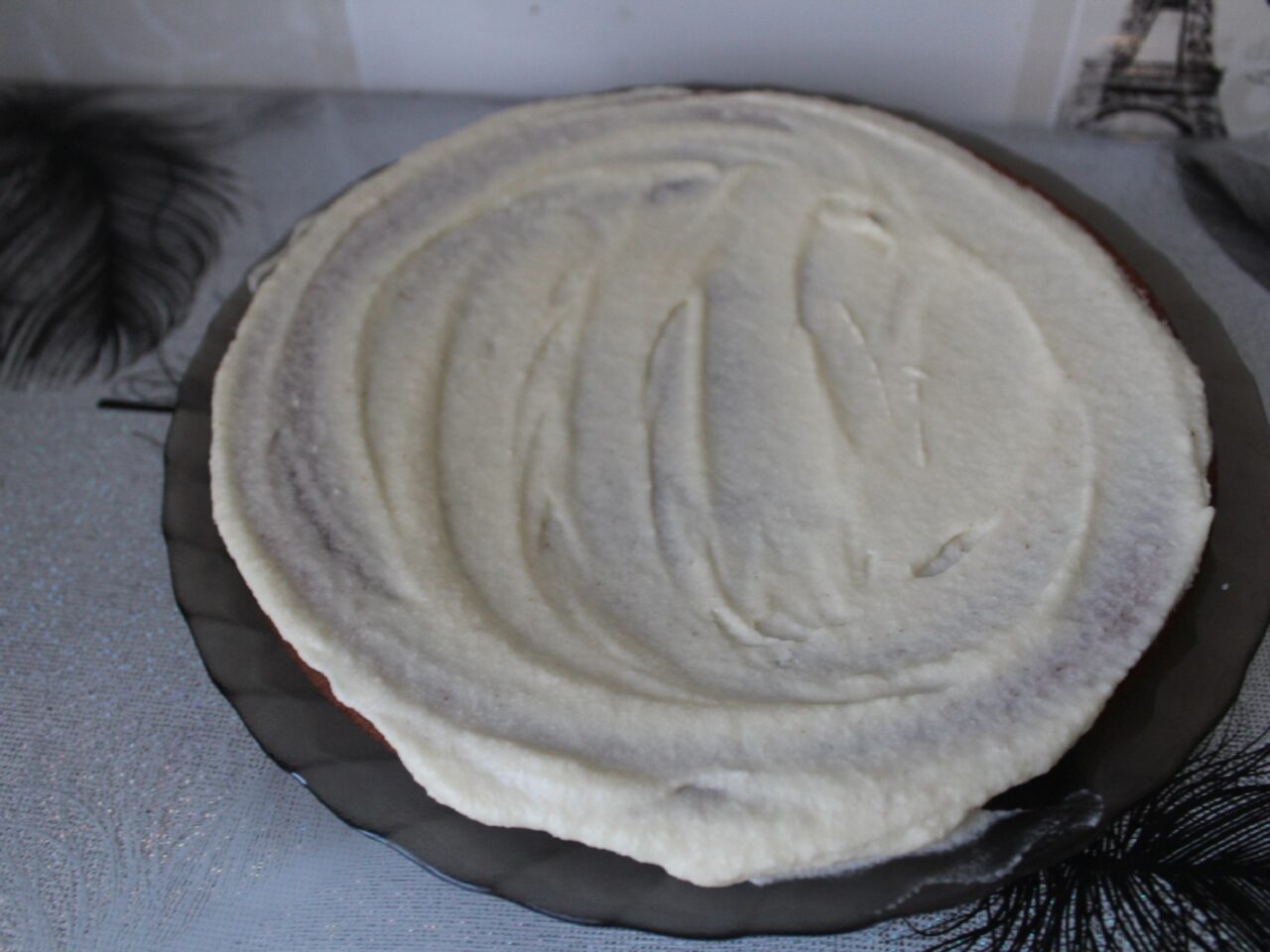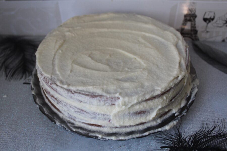 - Cover with the last layer, soak with sweet juice, and spread cream on the top and sides.