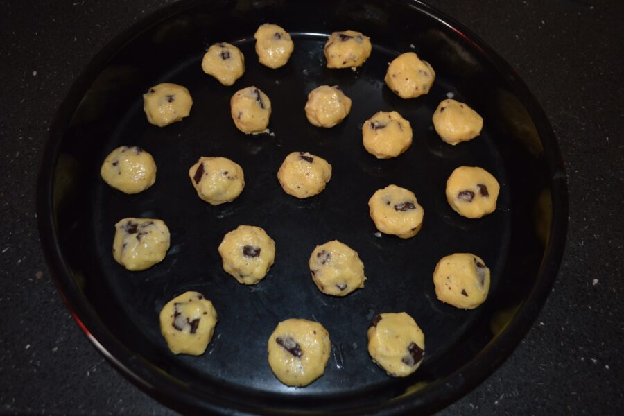 - Pour a little water into a deep plate to soak your hands so that you can shape the cookies into balls. Dip your hands in the water for each ball.