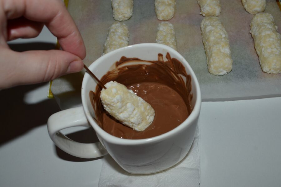 - Turn it so that the cottage cheese bars is covered with chocolate on all sides.
