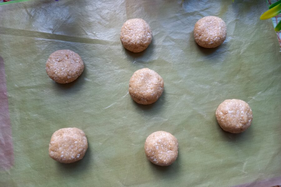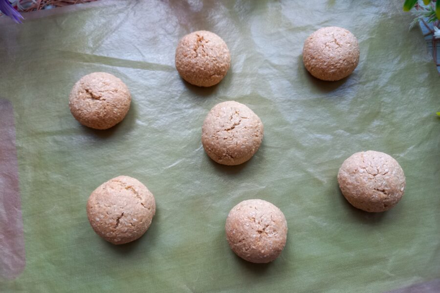 - We have a very sticky and soft dough. Divide it into 7 pieces and roll each piece into a ball. Place the pieces on a Teflon mat (parchment paper) and press lightly. We decided to make small cookies (about the size of a walnut). Carefully move the mat with the cookies to a baking sheet and place them in a preheated oven (180 °C) for about 25-27 minutes.