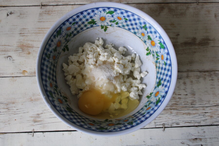 - Mix the cheese with the sugar, sour cream, vanilla, and egg.