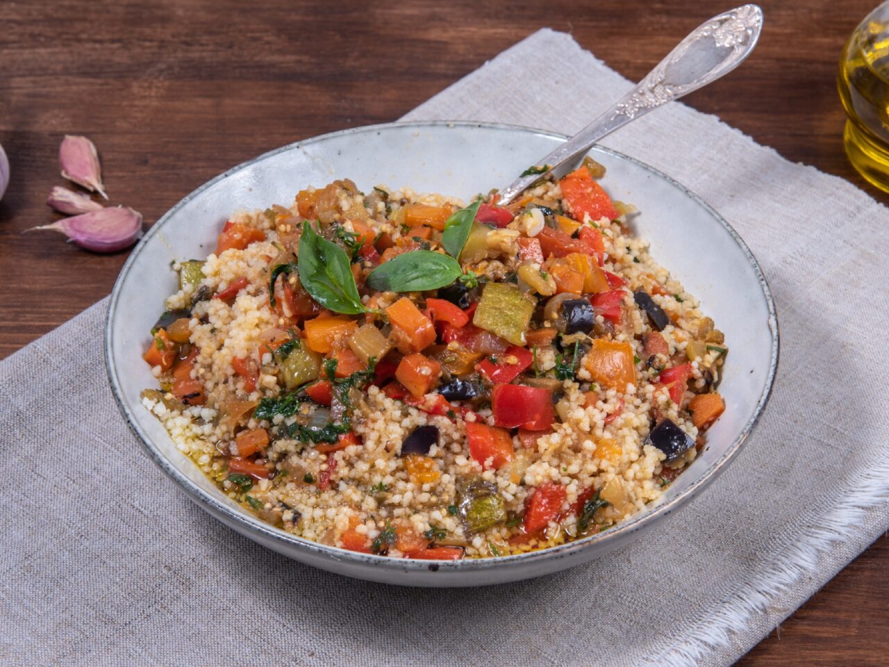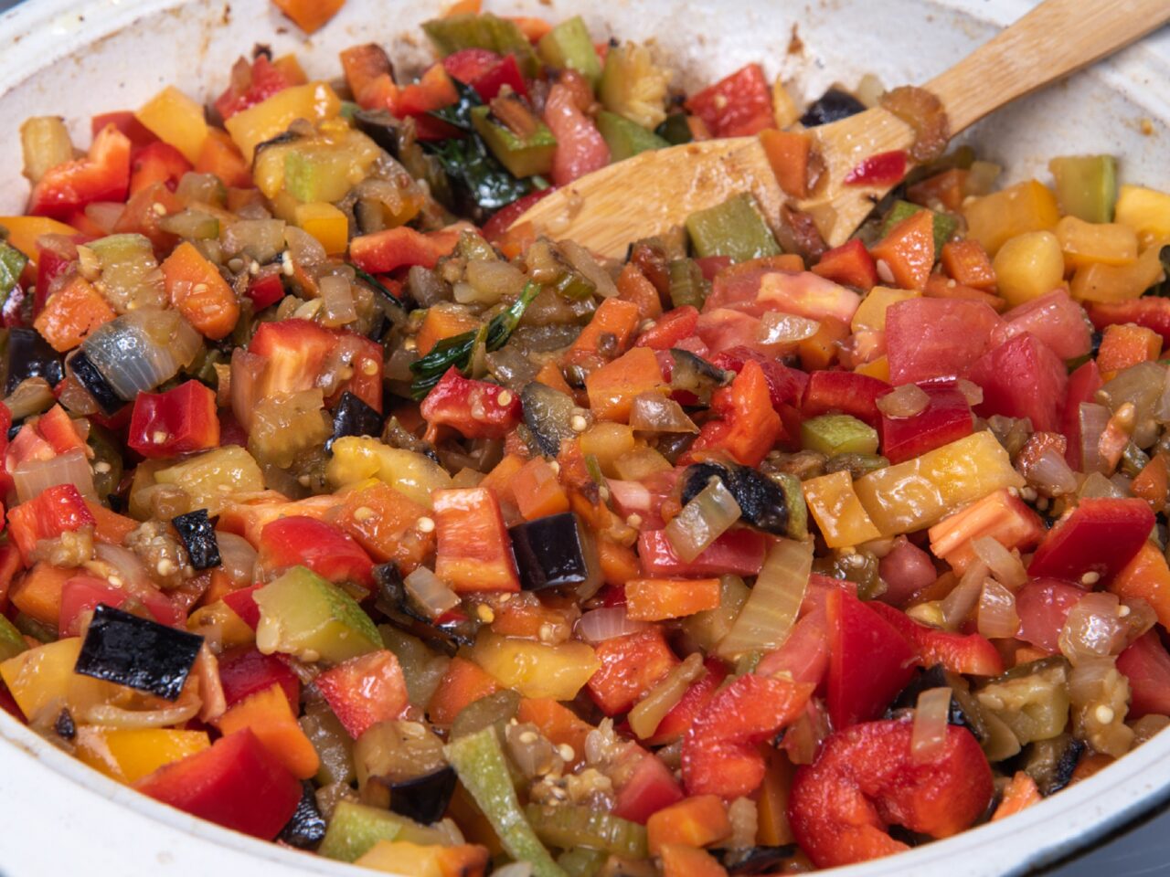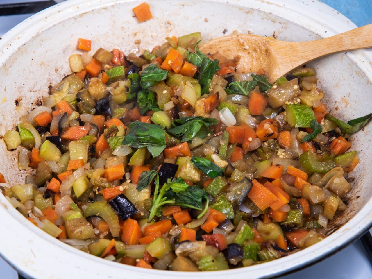 - While the couscous is cooking, prepare the vegetables. Chop all the vegetables into small pieces and sauté them in a pan in the following order: first add the onion, carrots, and celery and sauté them. Then add the zucchini and bell pepper. Sauté briefly and add the eggplant and tomatoes. Reduce the heat and cook for about 20 minutes.