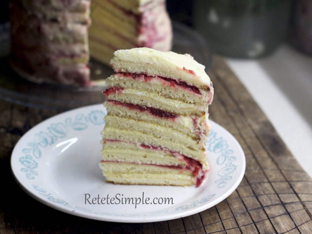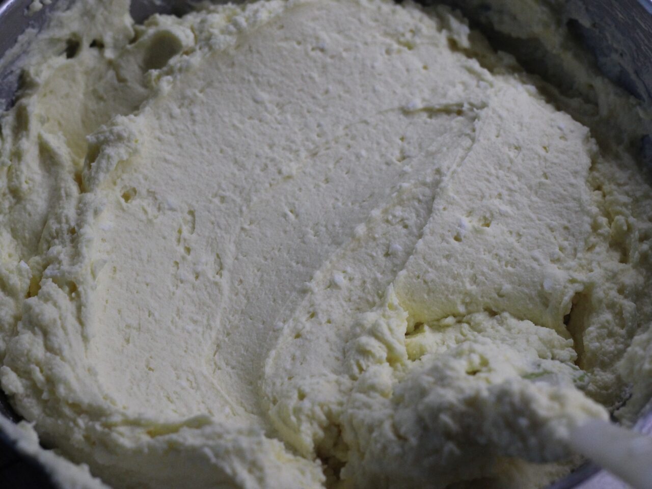 - Beat the full-fat cottage cheese with the powdered sugar for the cream. Add a pinch of salt and the sour cream. Whip the cream until light and fluffy. Put the candied strawberries and cream in the fridge and let the cakes cool completely.