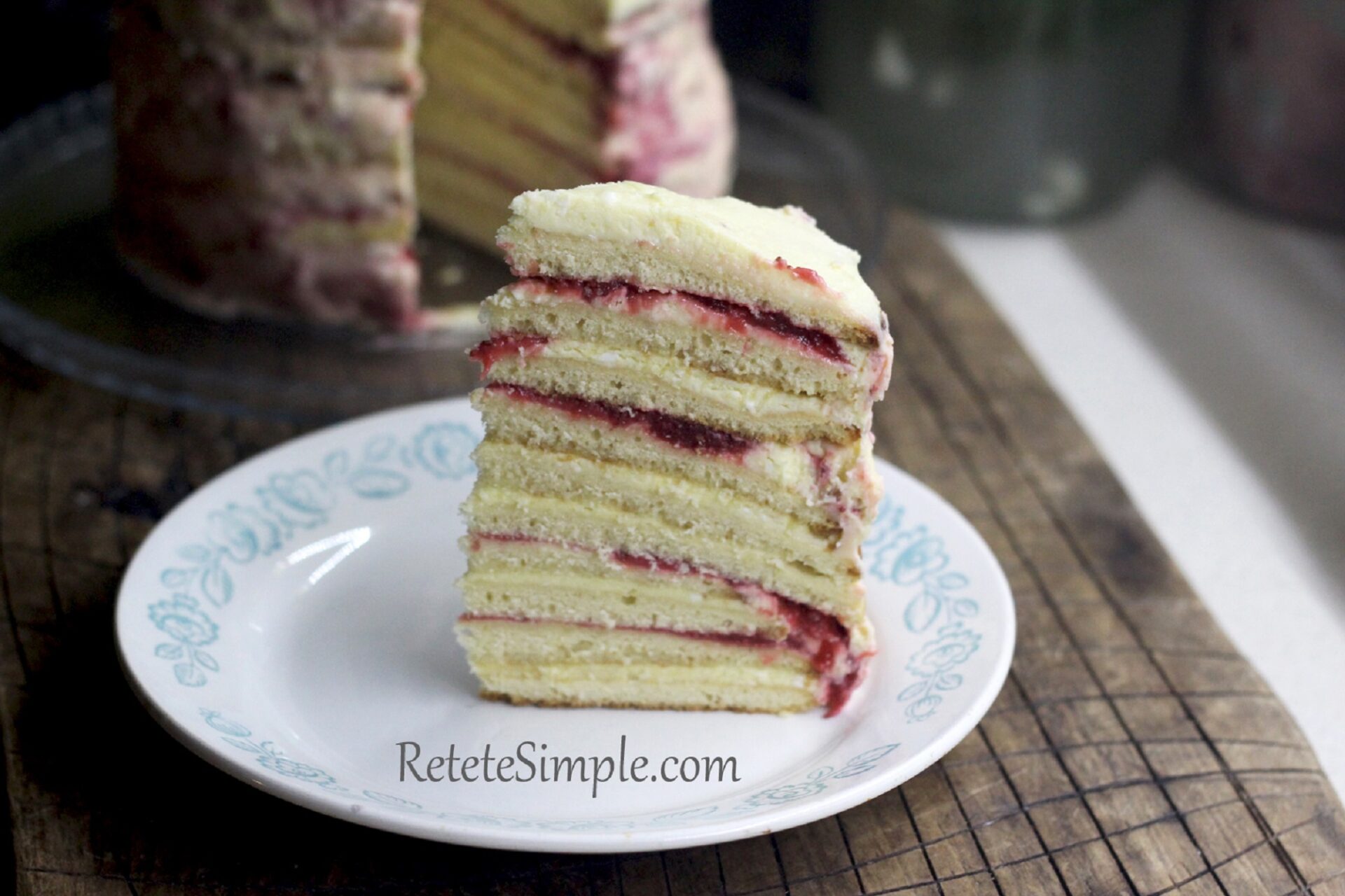 When all components are cold, you can start assembling the cake. Place the first baked layer on a serving plate and add a generous spoonful of cream, spreading it all the way to the edges. For more flavor and color, alternate between layers with just cream and layers where you add a thin stripe of strawberry confit in the middle. This way each slice will show a nice pattern of cream and fruit without becoming too wet. Continue until you use all layers, finishing with cream on top. At this stage the cake may look a bit uneven, but it will settle in the fridge as the layers absorb moisture. Wrap the cake lightly with plastic or place it in a tall container to protect it from drying out.