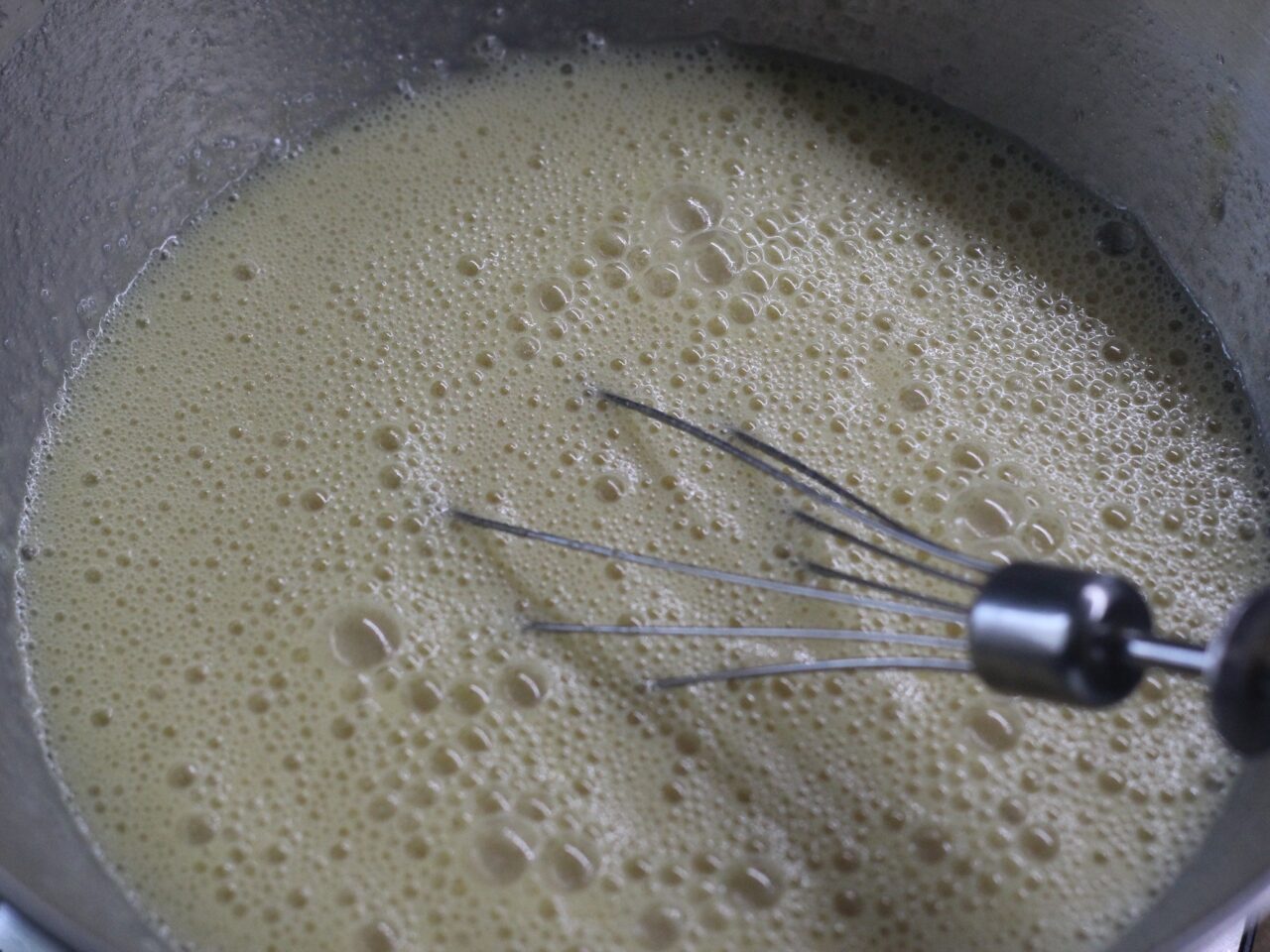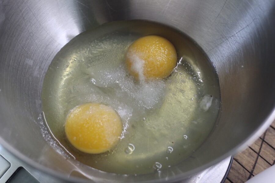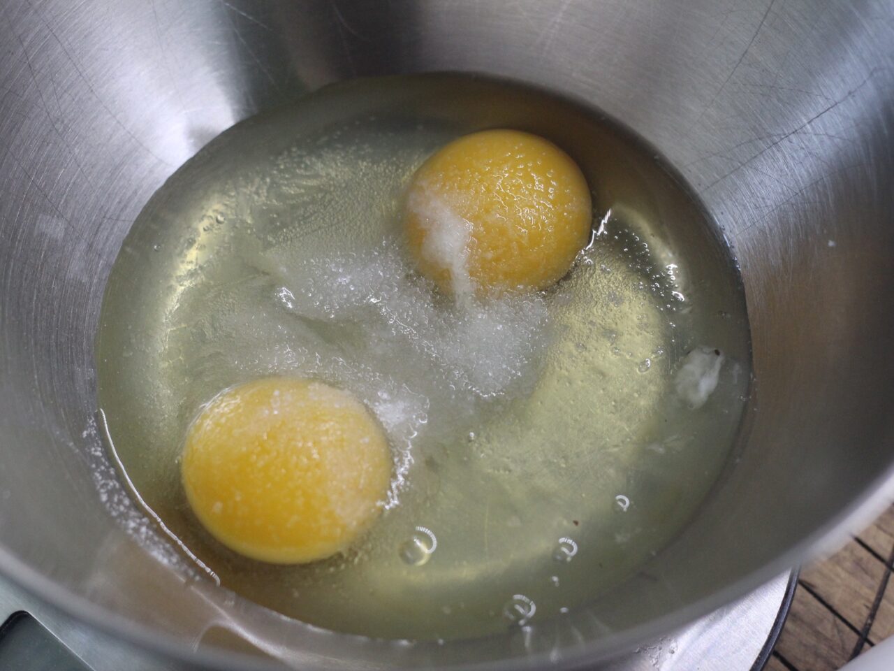 - First, beat the eggs with the salt and vanilla until light and fluffy using a mixer. The eggs should be warm.