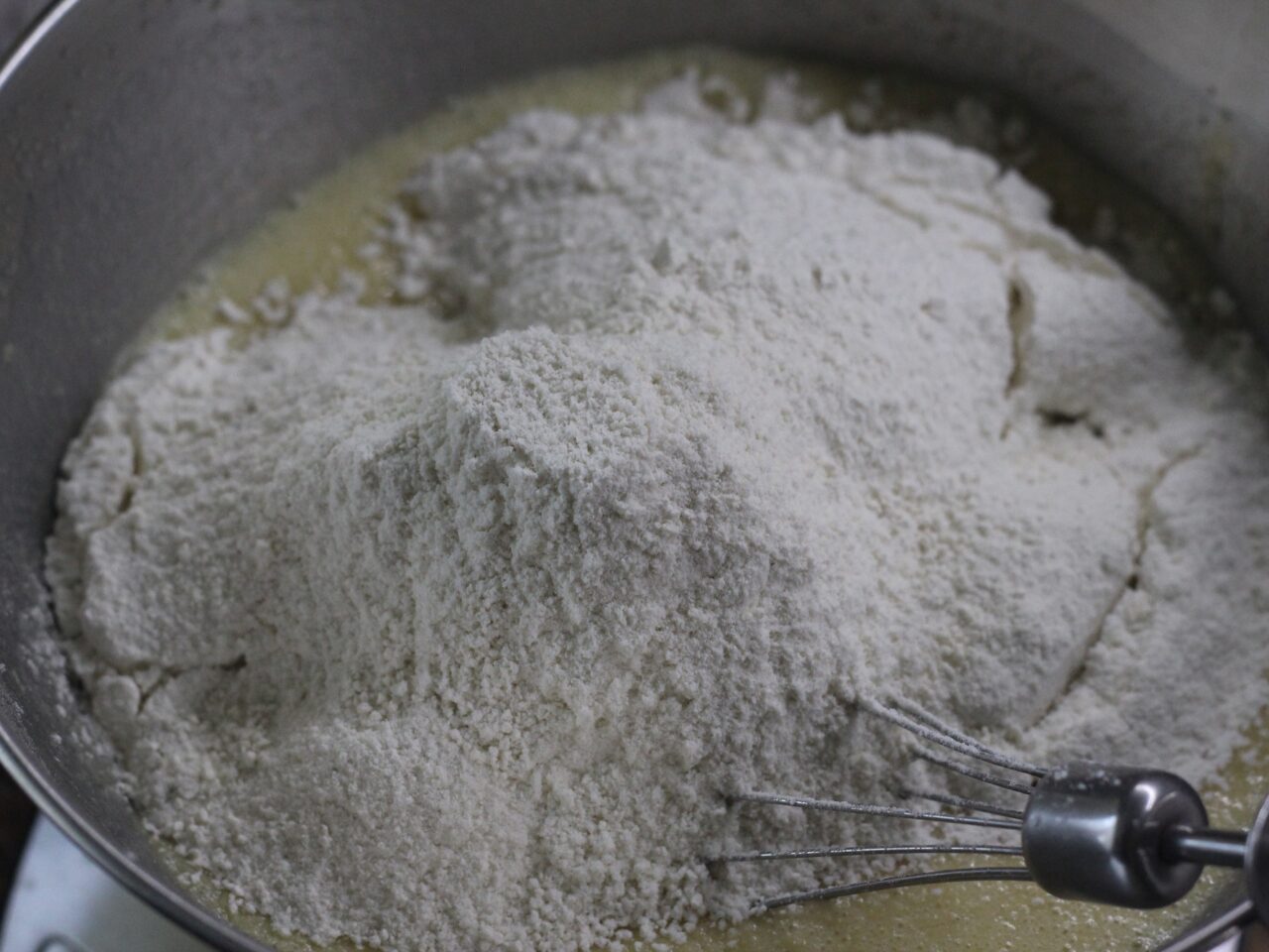 - Add the condensed milk and cooled melted butter to the egg mixture. Beat the ingredients together again.