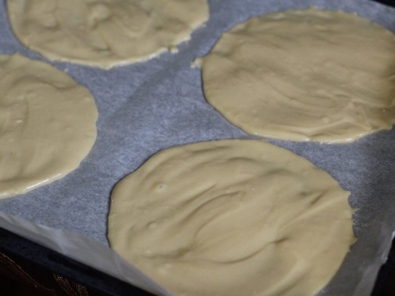 - Using a pastry ring or part of a mold, spread the dough on parchment paper with a spatula and spread evenly around the outline. You will get a total of 10 cookies with a diameter of 16 centimeters. Bake the cookies at 180 degrees until they turn slightly golden.