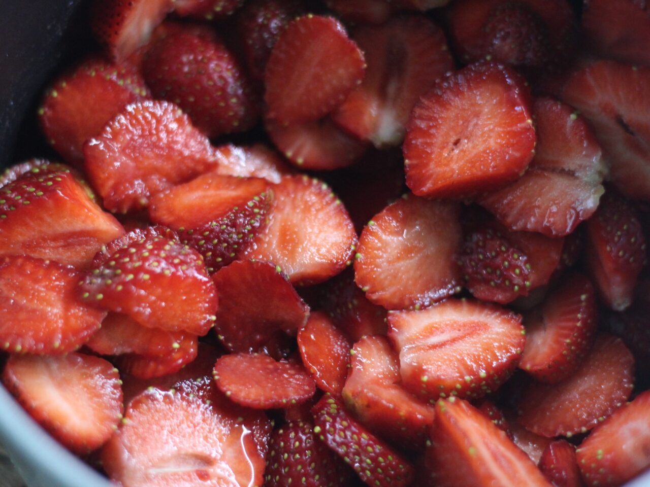 - Clean and wash the strawberries, cut them up, and place them in a saucepan.