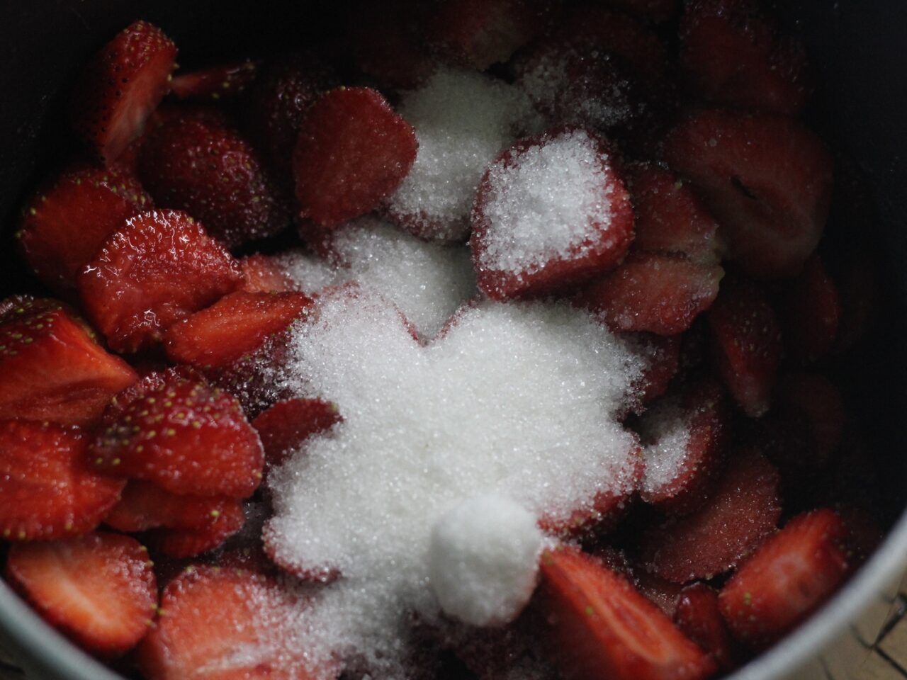 - Add the starch mixed with sugar to the strawberries. Simmer the berry confit over low heat until thickened.