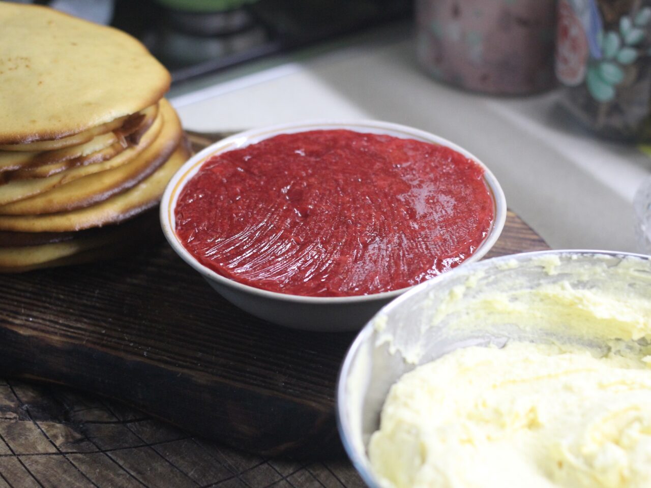 - Assemble the cake by spreading the cream on the cakes. Add a layer of candied berries on top of the cake. Refrigerate the assembled cake overnight.