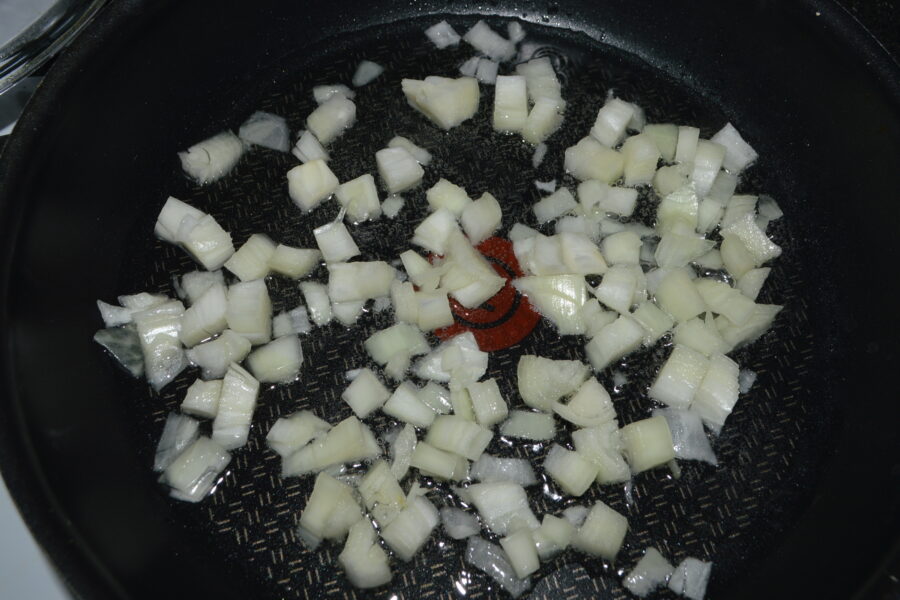 - Heat a little oil in a pan and fry the onion over low heat.