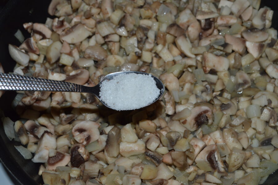 - Add the chopped mushrooms to the pan.