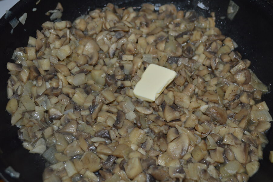 - Drain the water from the pan that the mushrooms left behind, and add a knob of butter.