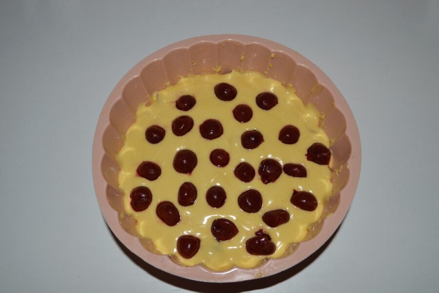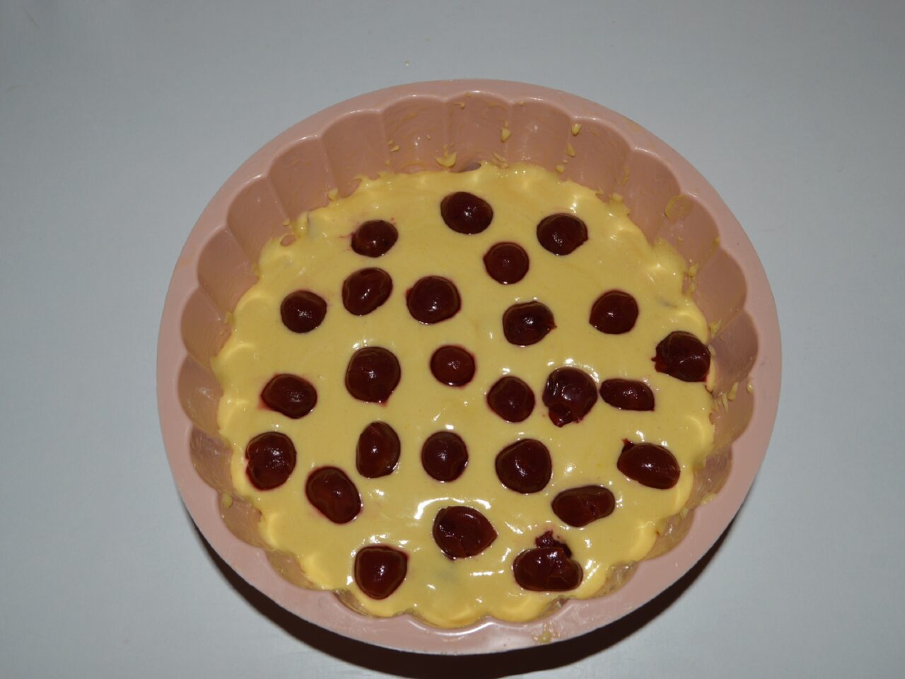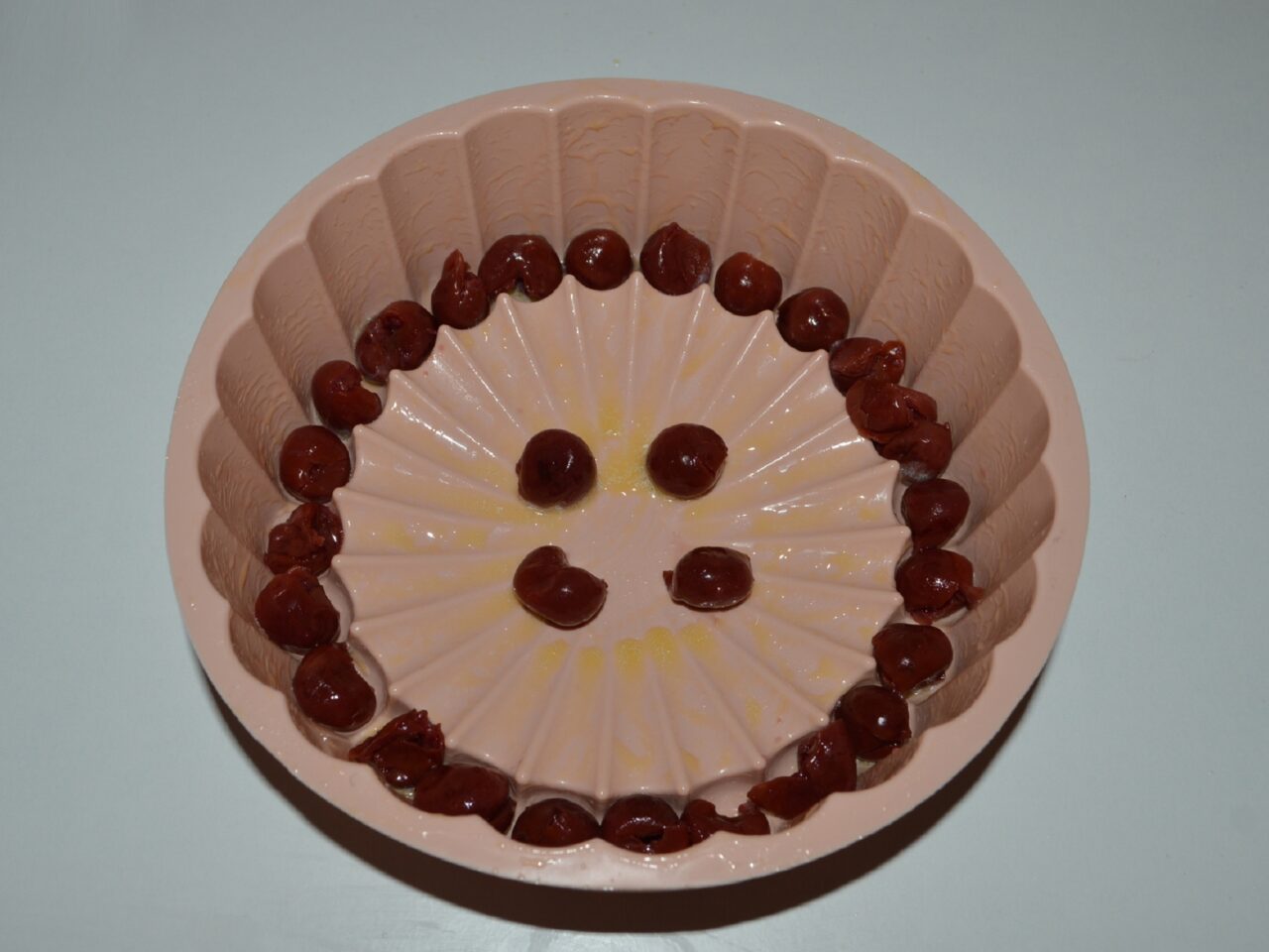 - Arrange the cherries on top of the mixture in the mold. Bake at 180 degrees for 35-40 minutes.