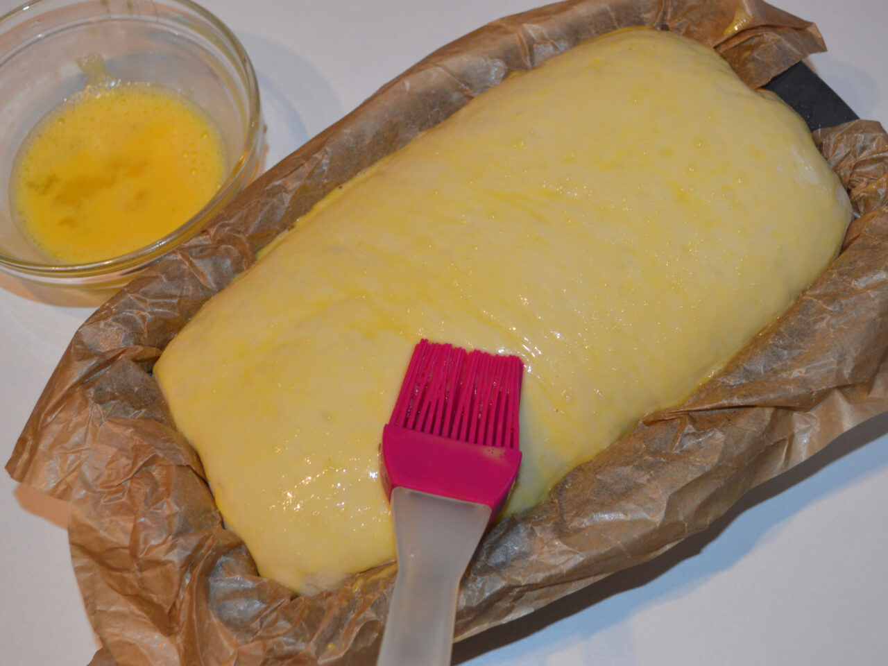 - Whisk an egg and use a pastry brush to grease the bread.