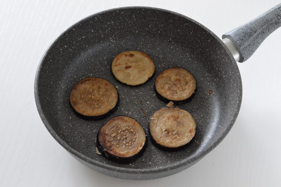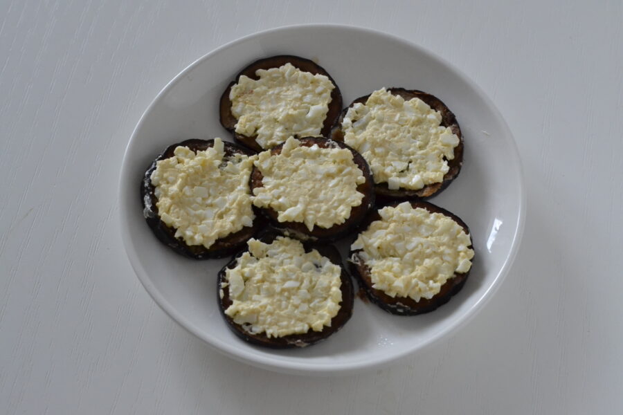 - Spread a medium layer of egg filling on each slice of eggplant.
