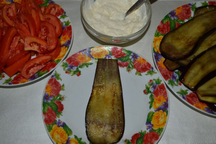 - Prepare the table: fried eggplant, chopped tomatoes, mayonnaise sauce, and put a slice of eggplant on a plate.