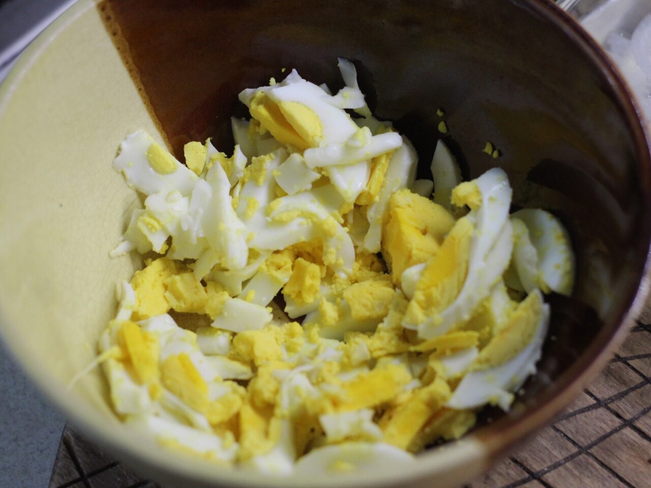- First, you need to cut the boiled eggs into strips and place in a salad bowl.