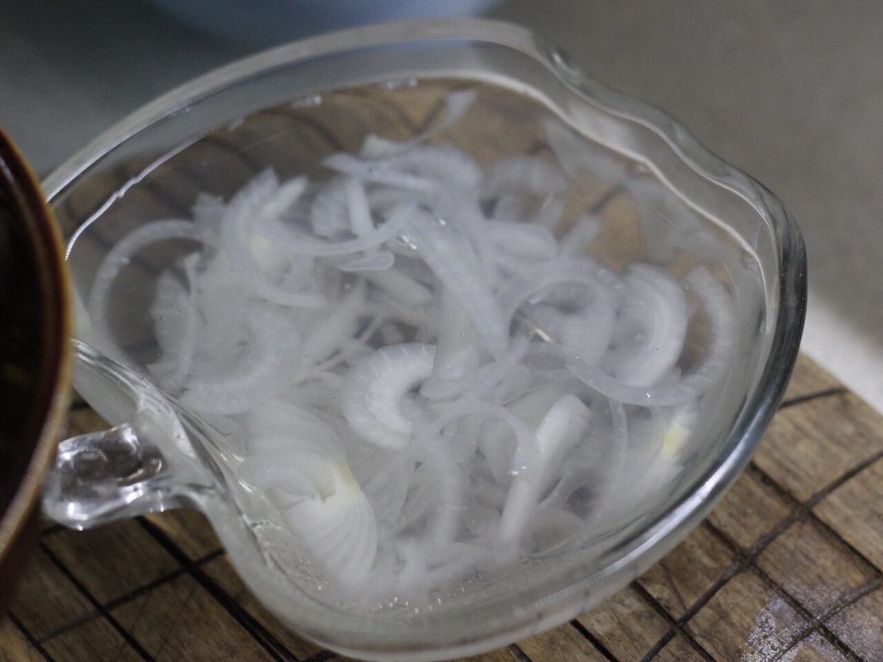 - Marinate the onion by pouring the chopped onion into boiling water with salt, vinegar, and sugar for 15 minutes.