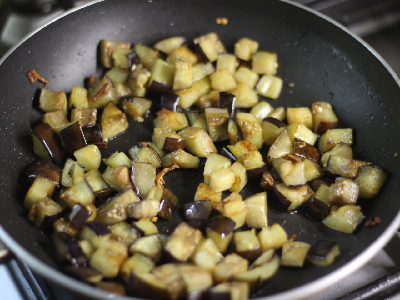 - Cut the eggplants into cubes and fry them in oil together with the chopped dried mushrooms until they become golden and soft.