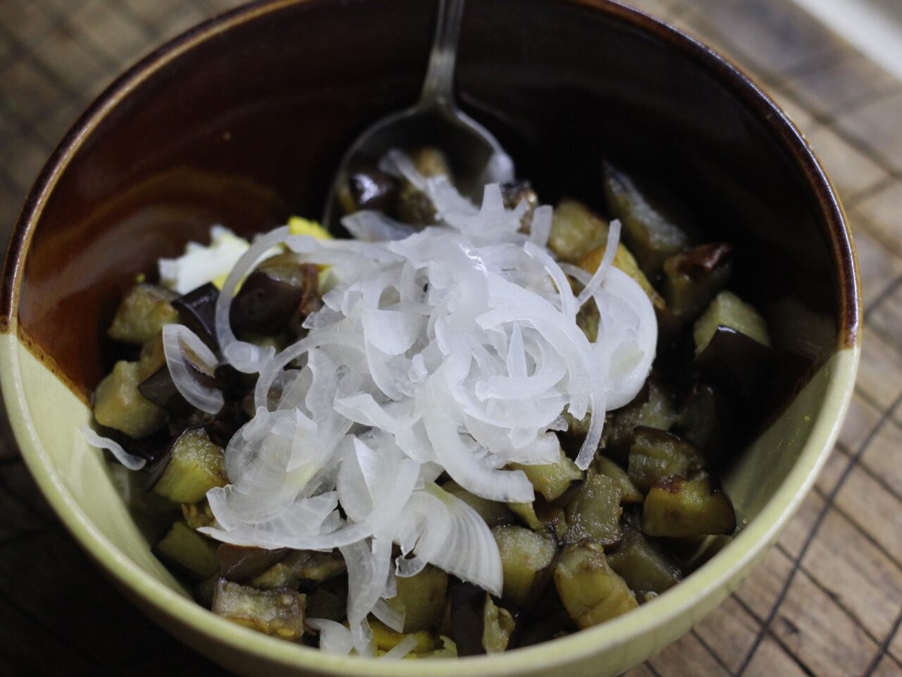 - Pour the cooled eggplants and dried marinated onions into the salad bowl.