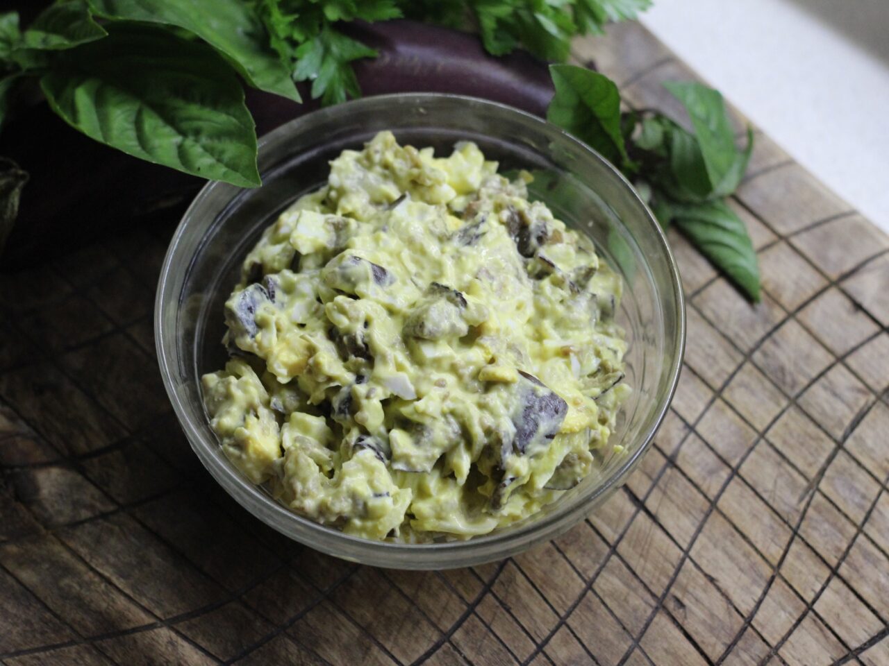 - Season the appetizer with a mayonnaise sauce. The delicious and hearty eggplant salad is ready! Enjoy!