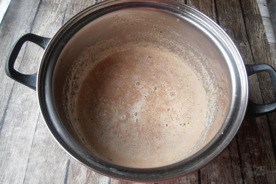 - Add apple cider vinegar, spices, and baking soda. Beat the batter until the baking soda has dissolved.