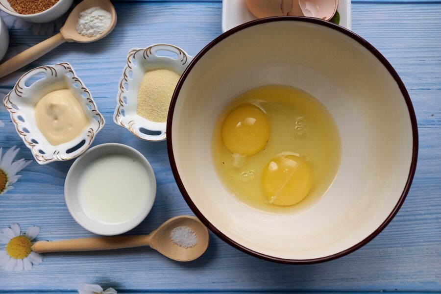 - Crack the eggs into a heatproof bowl. Pour the milk into the same bowl, followed by the mayonnaise, salt, and semolina. Mix everything well.