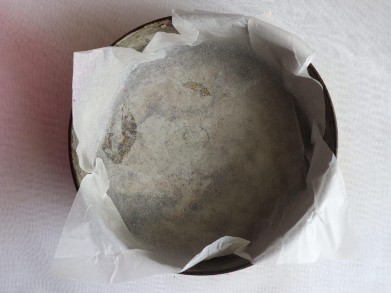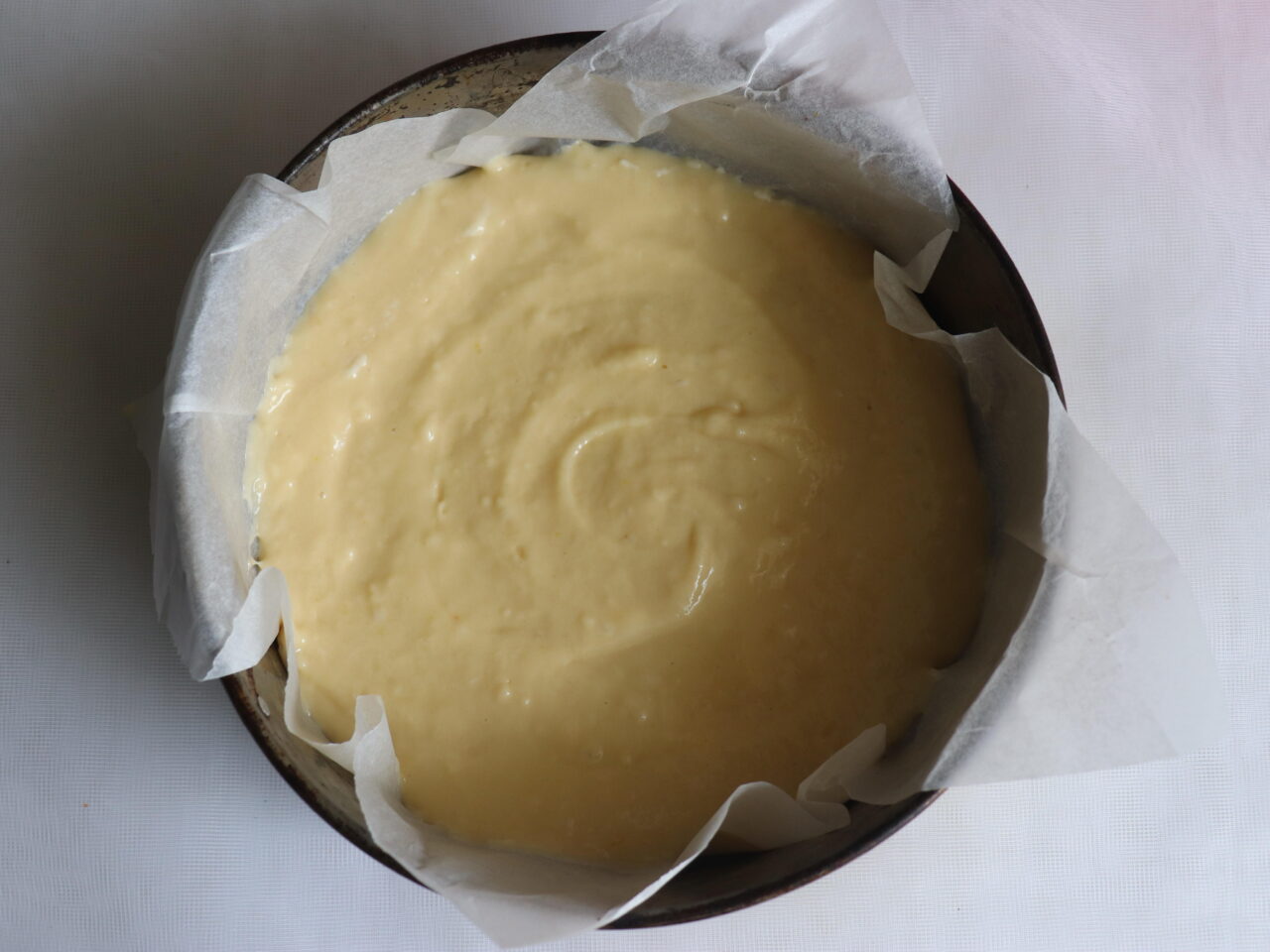 - Start molding the cake. To do this, line a 24 cm diameter pan with parchment paper.