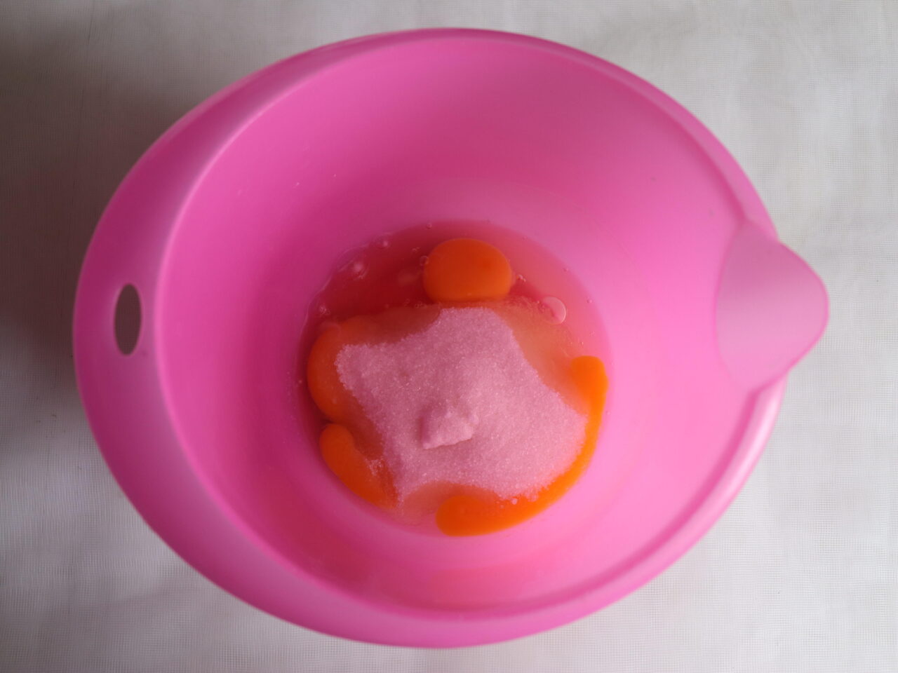 - In another bowl, break the eggs. Then add the sugar to the eggs.