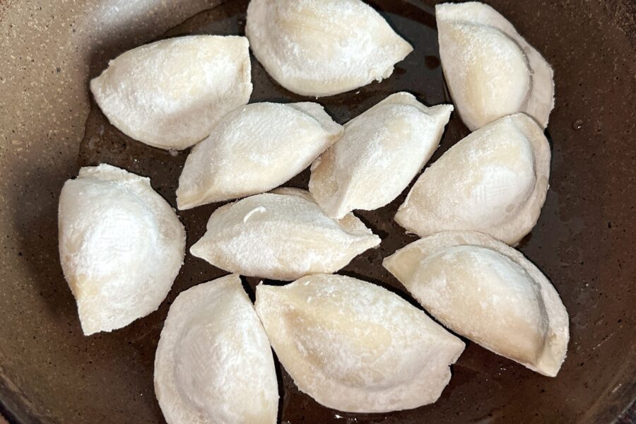 - First, pour vegetable oil into the pan and heat over medium heat. Then add the semi-finished dumplings. Fry for 5 minutes on one side.