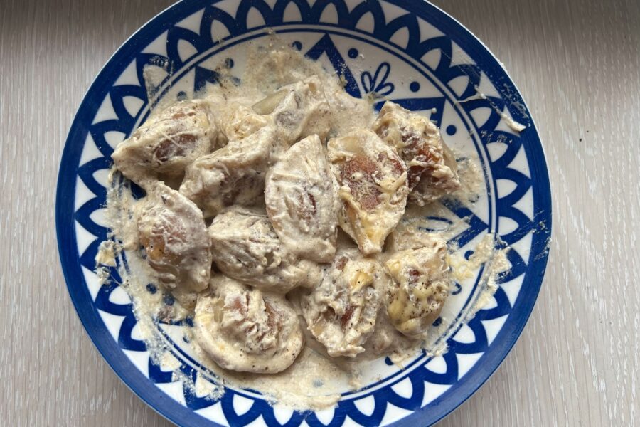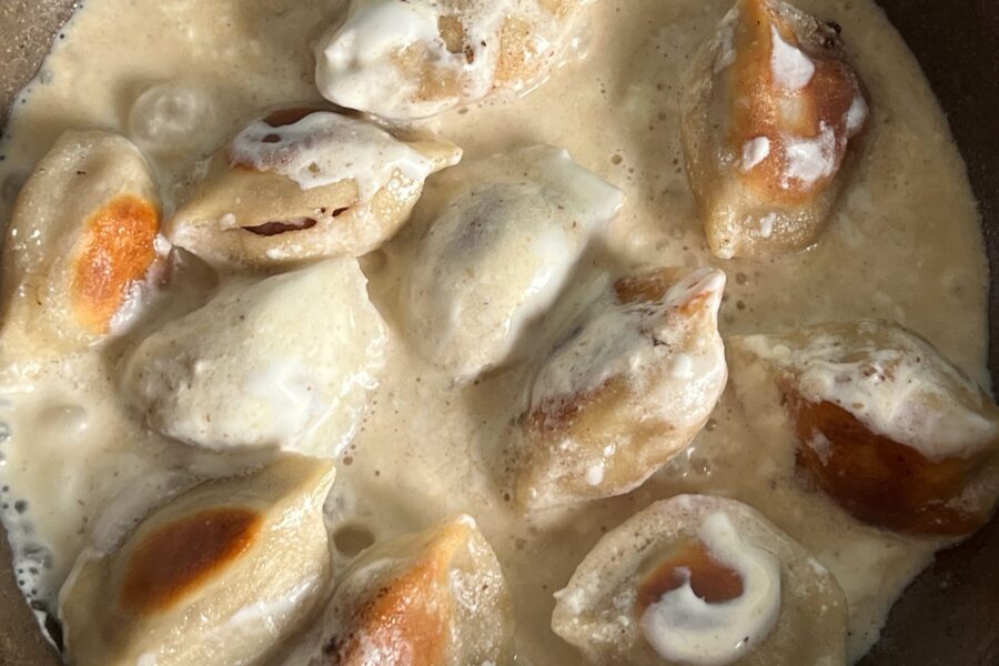 Fried dumplings in sour cream sauce combine crispy browned dough with the delicacy of creamy sauce. The recipe is simple and offers an authentic taste, suitable for lunch or dinner. They can be served plain or with a salad, as a tasty and easy-to-make main course. It is a versatile recipe that can be customized to your taste, perhaps adding some cheese or vegetables for extra flavor. Fried dumplings in sour cream sauce are ideal for a quick and delicious meal.