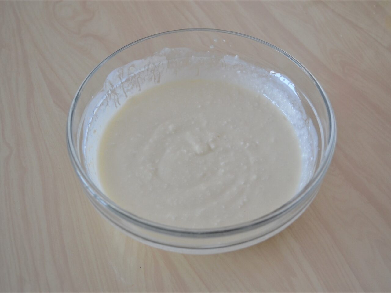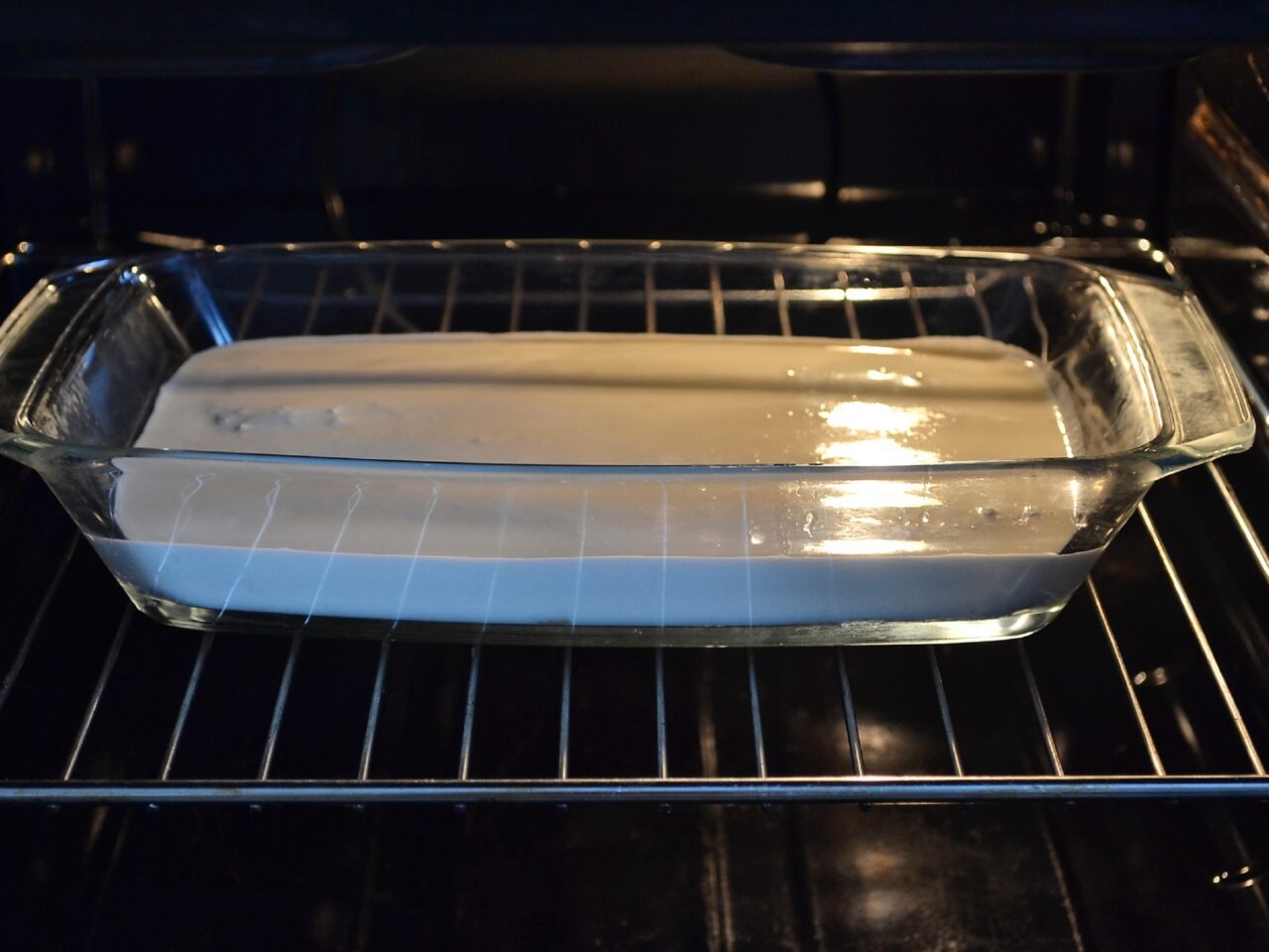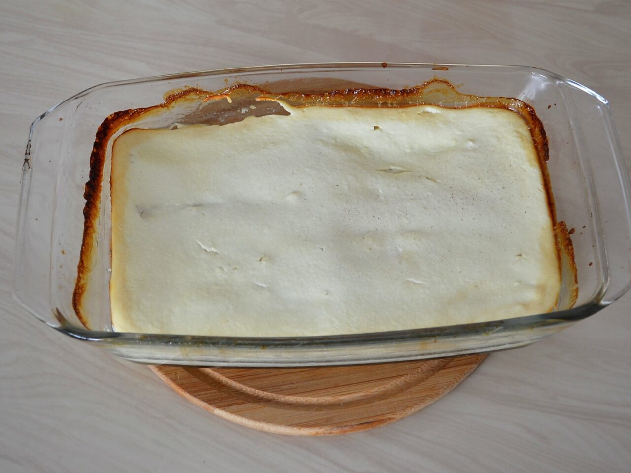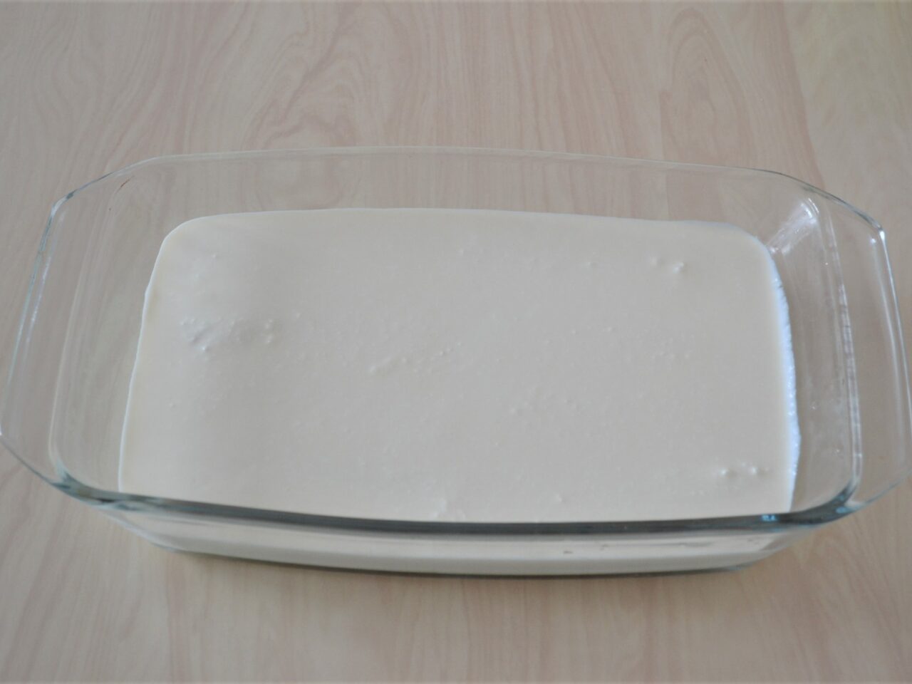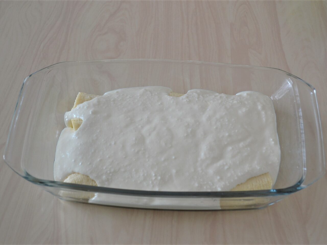 - Carefully pour the cheese and kefir mixture over the bananas.