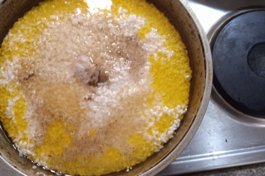 - Now we apply all the spices and fill the rice. Push a whole head of garlic into the middle of the rice. The water should cover the rice by 1 centimeter. Refill if necessary. Bring the contents to a boil over high heat and immediately turn down the heat to the lowest setting.