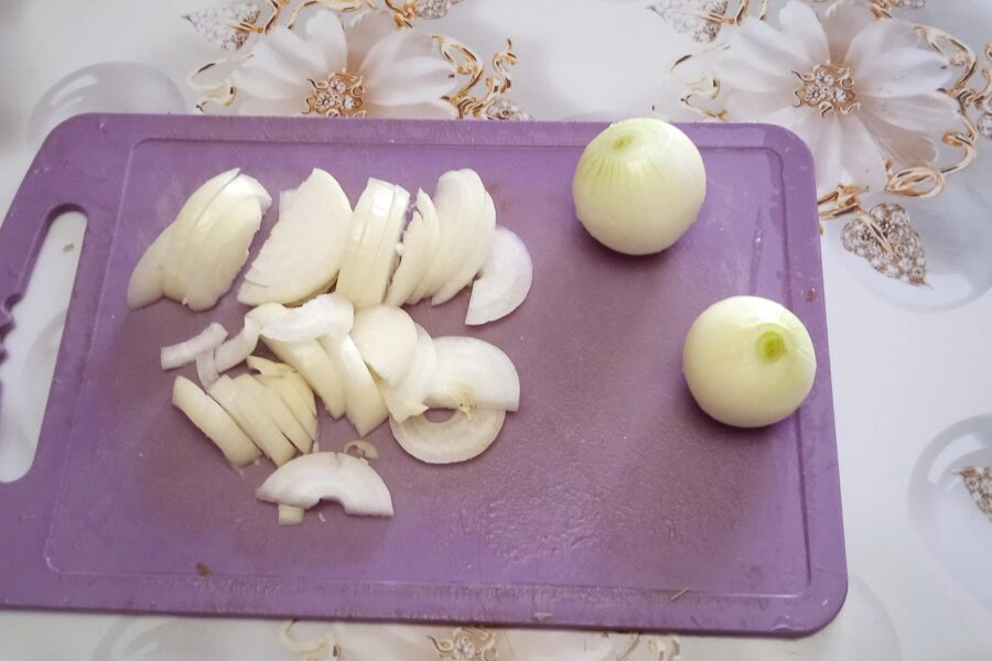 - Now it’s the turn of onions and carrots. Cut the onions in half rings.