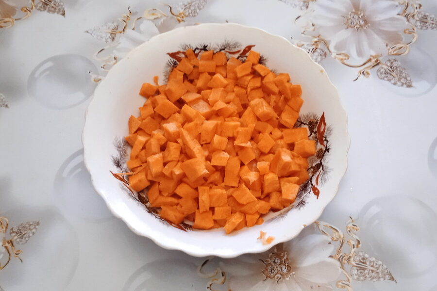 - Carrots coarsely. Either diced or chopped. It is not desirable to grate them. Otherwise, as the Uzbeks say, the carrots will be lost.