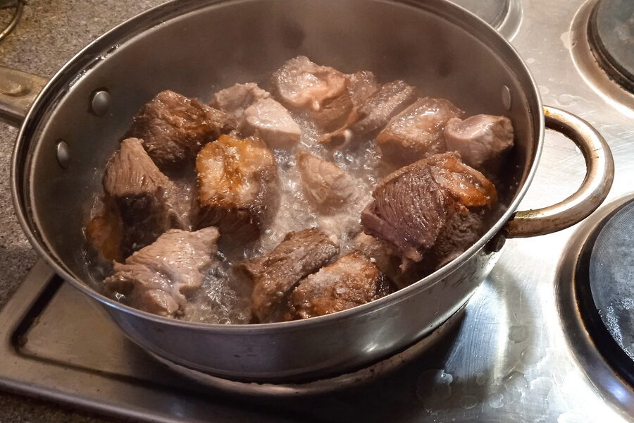 - While we were busy with the vegetables, the meat was stewing. Separate the meat from the bones and return it to the cauldron.