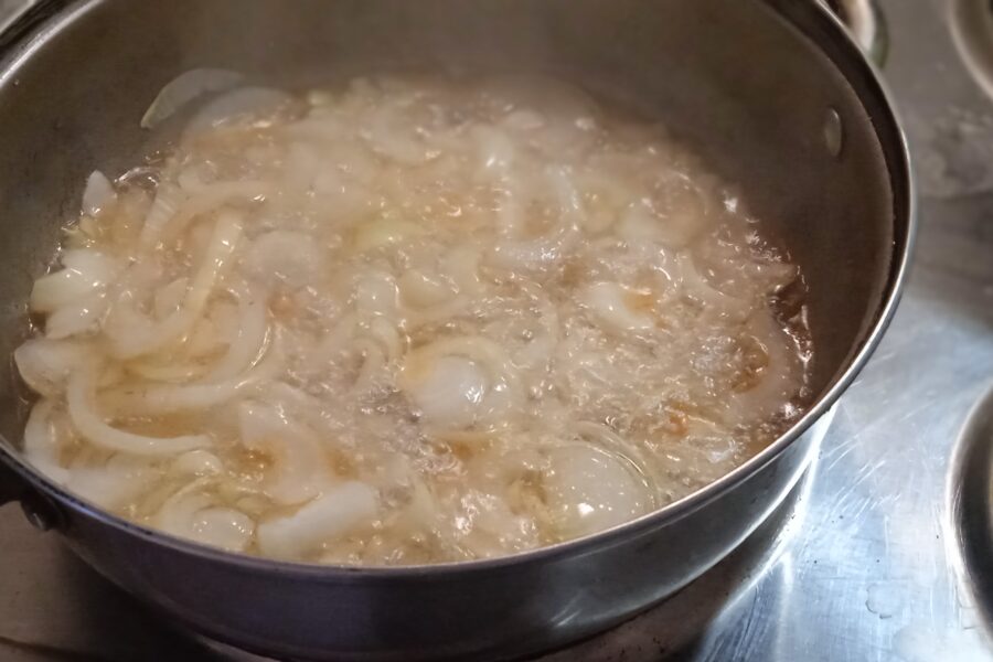 - Put the onions in the skillet, in the oil where the ribs were fried. Fry until the onion changes color and becomes like a blonde’s hair. Add the carrots. Fry, stirring, until the carrots turn brown.