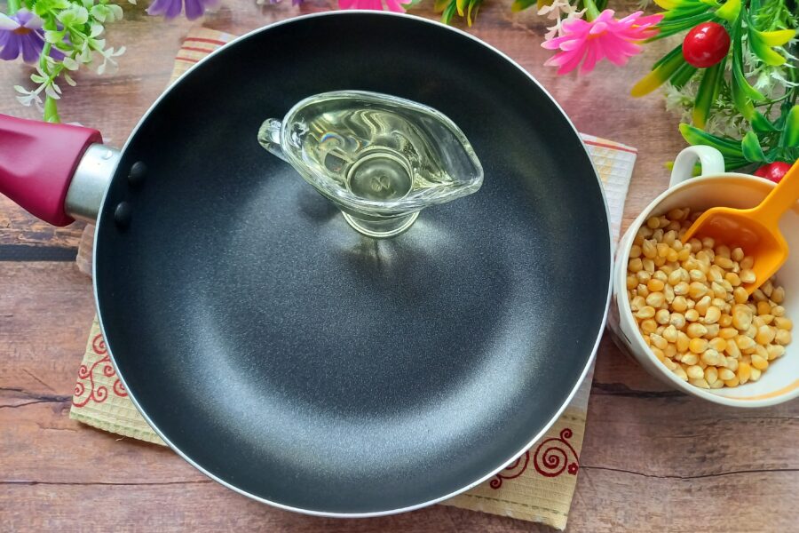 To make popcorn, it is recommended to use non-stick cookware. This can be a deep frying pan or a saucepan. We will take a small frying pan (its diameter is 20 cm and its depth is 5 cm). And we will definitely need a lid for it.