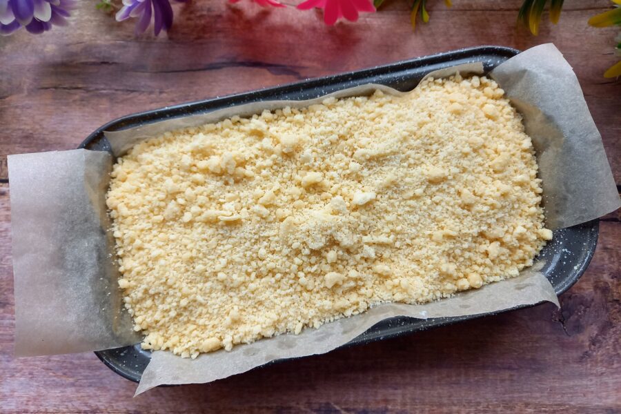 - Spread about two-thirds of the crumbly dough into the mold, making sure to make small sides.