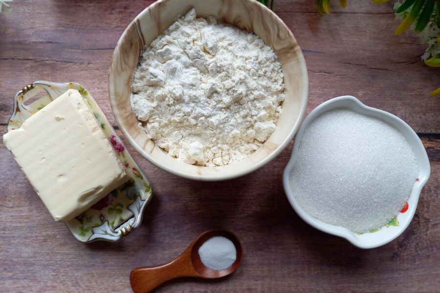 - Mix the flour with the sugar and add the baking soda. Then add the chopped margarine (or grated with a grater).
