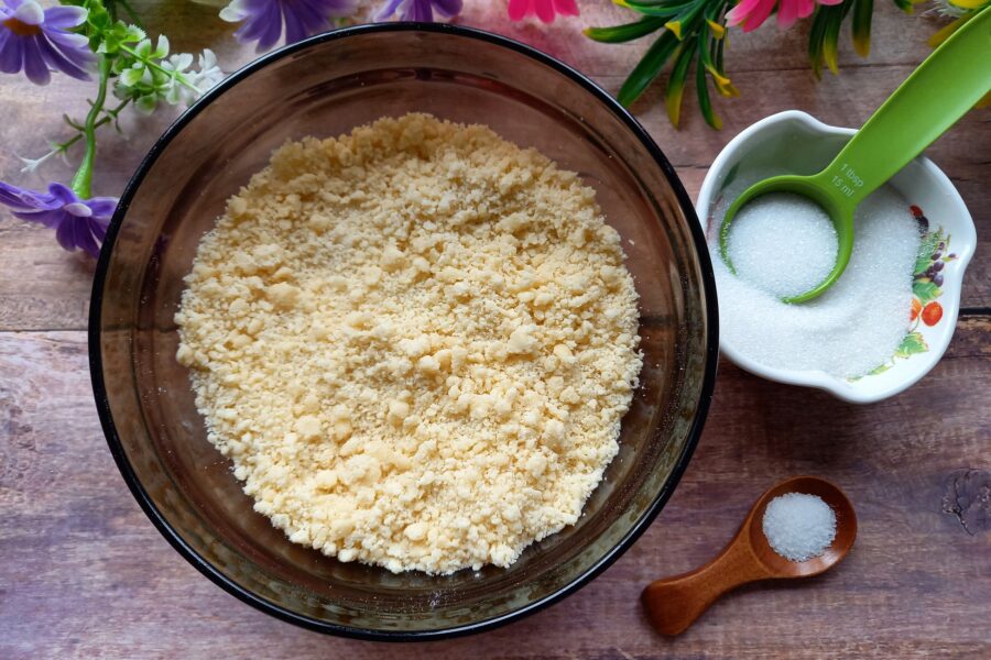 - Mix all ingredients until crumbly. It is most convenient to do this using a blender with a bowl attachment. We will also add salt. The base for the dough is ready.