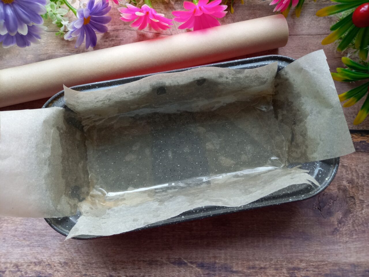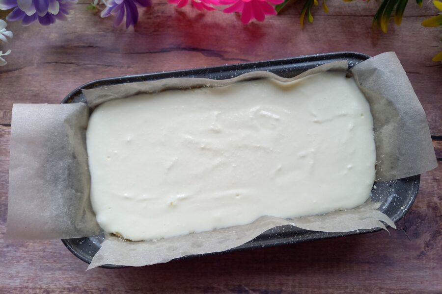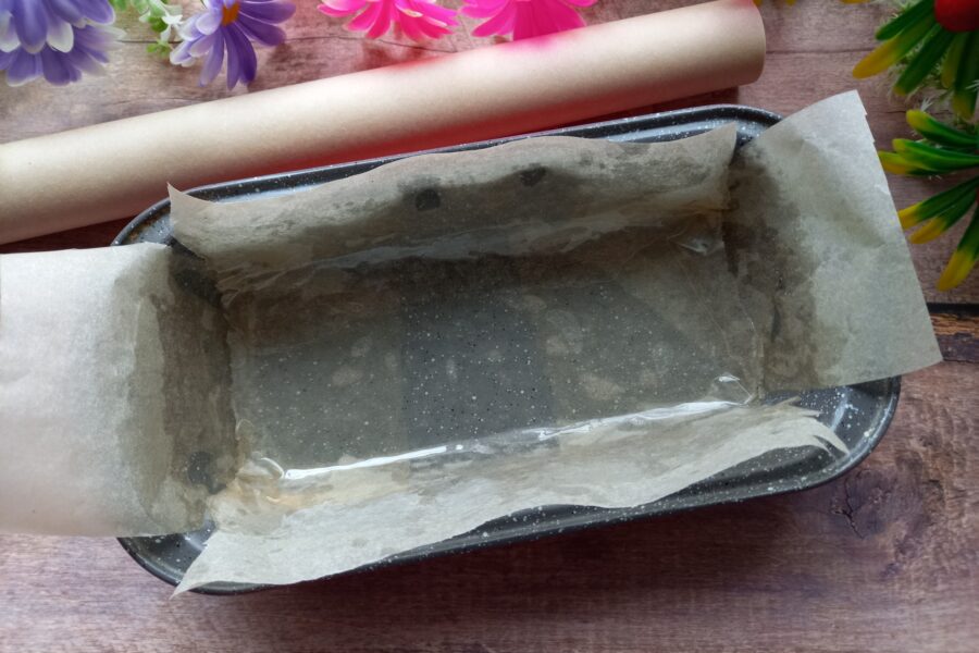 - But first, let’s prepare the mold. Since we don’t have a mold of the right size (and it’s much easier to remove such delicate pastries from it), we will cover the metal container (its dimensions are 18 x 8 x 5 cm) with well-greased baking paper.